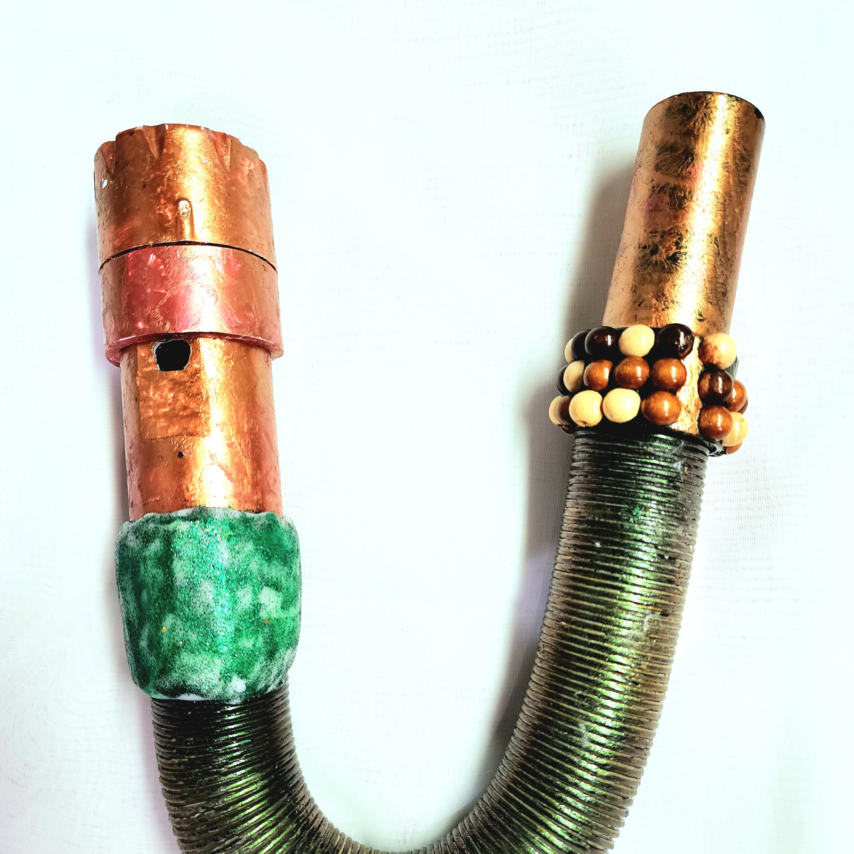 I discovered that people listen to recordings of this underwater music to relax and enter a mindful state. Something I know will especially help the grieving. Each Whale Flute is hand-built from reclaimed materials, with a spring reverb chamber for deep echo and a flexible hose for tone control. Blow gently or firmly and adjust the hose to discover your own unique sounds.